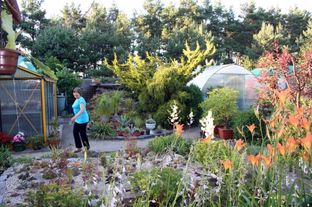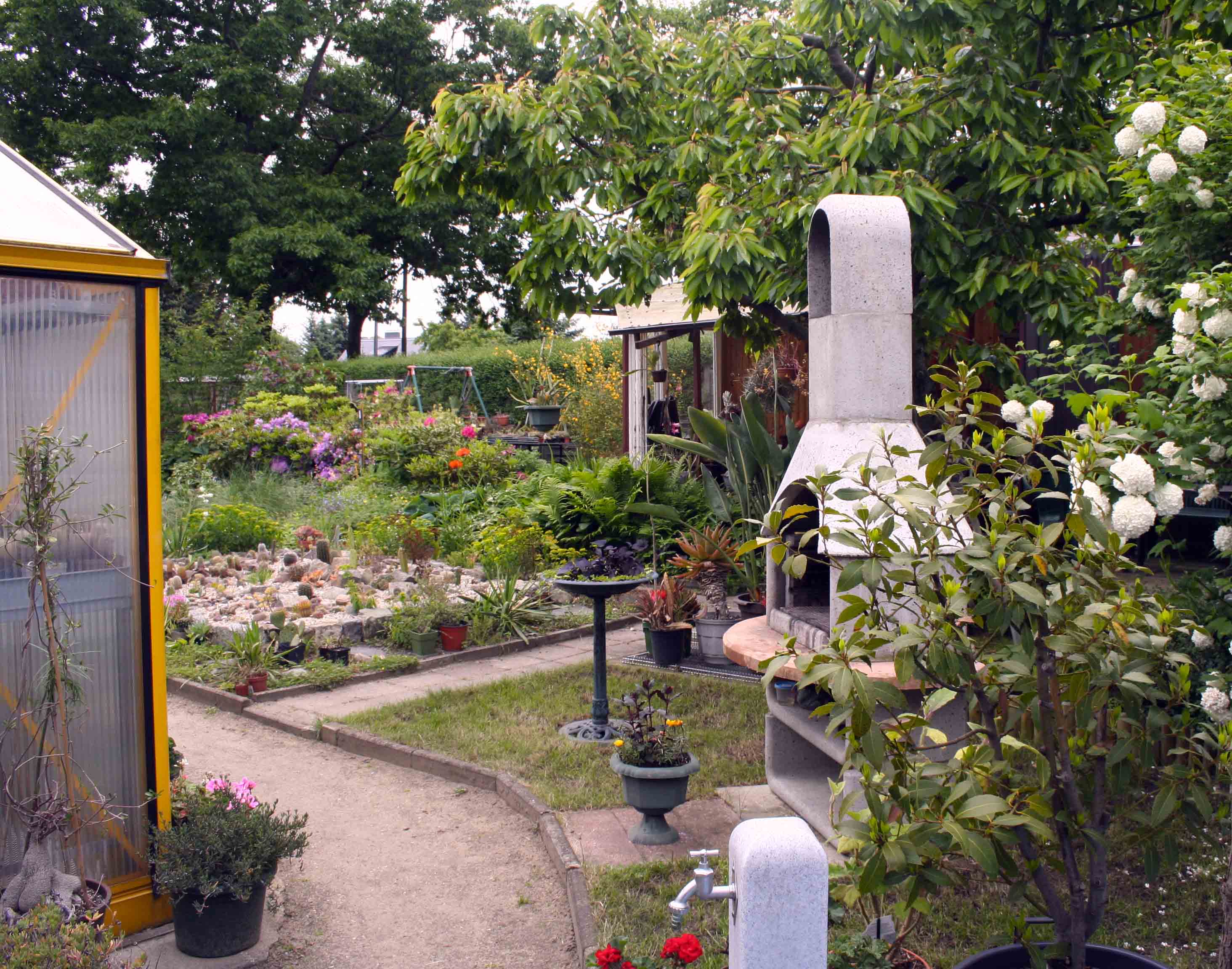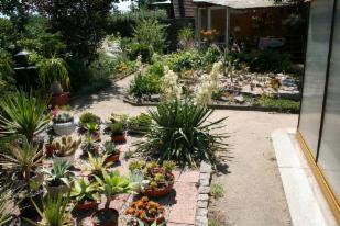 Auf den ca. 1000 m² großen Fläche ist neben drei Gewächshäusern, den Freiflächen, Terassen und Wirtschaftsgebäuden auch ausreichend Platz für Gehölze und umfangreicheStaudenbereiche. Natürlich ist unser Garten auch ein Obst- und ein etwas kleinerer Gemüsegarten. Die Pflege unser doch recht umfangreichen Sammlung von Kakteen und anderen Sukkulenten und auch die Gartenarbeit verlangen natürlich auch nach Orten der Erholung. Sei es am kleinen Teich, der schattigen Terasse, es gibt hier und da im Garten ein Plätzchen, wo man verweilen und auch dieses oder jenes Fachgespräch führen kann.