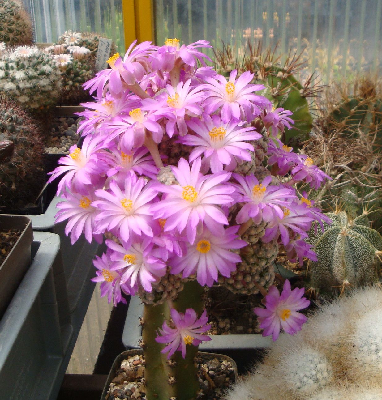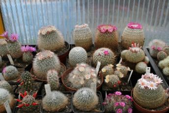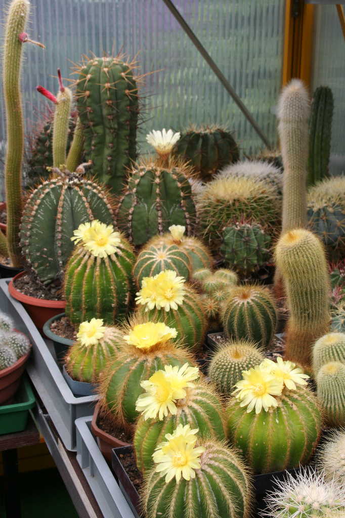 Die Kakteen machen in unserer Sammlung den größeren Teil aus, sei es von der Anzahl als auch der Gattungsvielfallt her gesehen. Das liegt auch darin begründet, dass die Liebe zu den anderen Sukkulenten erst Anfang der achtziger Jahre begann, mit Gründung der ZAG Andere Sukkulenten beim Kulturbund der DDR. Zu dieser Zeit waren wir schon mehrere Jahre Mitglied der ZAG Mammillarien und die Mammillarien bilden deshalb auch den Mittelpunkt im Reich unserer Kakteen. Wenn auch auf den Tischen und Hängen von fast jeder Gattung eine oder auch mehrere Pflanzen zu finden sind, so sind doch größere Gruppen von den nachstehend aufgeführten Gattungen vorrangig zu finden: